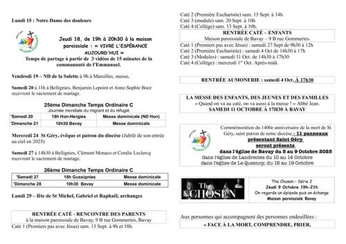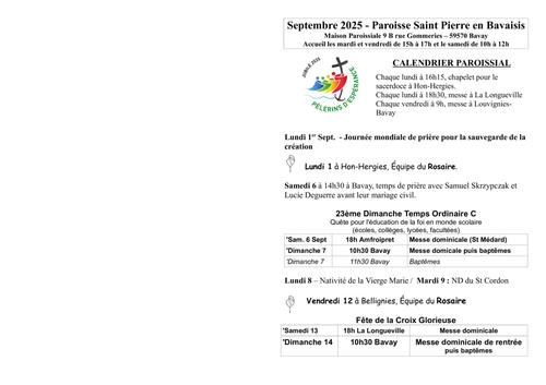 Feuille des évènement paroissiaux du mois de Septembre 2025, cette feuille contient les informations relatives aux messes, temps de prière, groupes de partage, évènements de la paroisse.